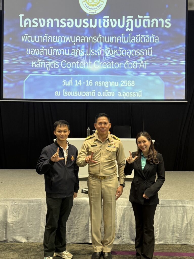 ระหว่างวันที่ 14-16 กรกฎาคม 2568 นางจิรประภา พิทักษ์สกุลพงศ์ ผู้อำนวยการ สกร.ระดับอำเภอวังสามหมอ มอบหมายให้ นายสงกรานต์ ชาติบุตร ครู ศกร.และนางสาวภัททิรา ทองเฟื้อง ครู ศรช. เข้าร่วมอบรม“พัฒนาศักยภาพบุคลากรด้านเทคโนโลยีดิจิทัลของกรมส่งเสริมการเรียนรู้ หลักสูตร Content Creator ด้วย AI” ซึ่งจัดขึ้น โดยมีนายชินกร คะอังกุ ผู้อำนวยการสำนักงานส่งเสริมการเรียนรู้ประจำจังหวัดอุดรธานีเป็นประธานในพิธีเปิด ณ โรงแรมเวลาดี อำเภอเมือง จังหวัดอุดรธานี