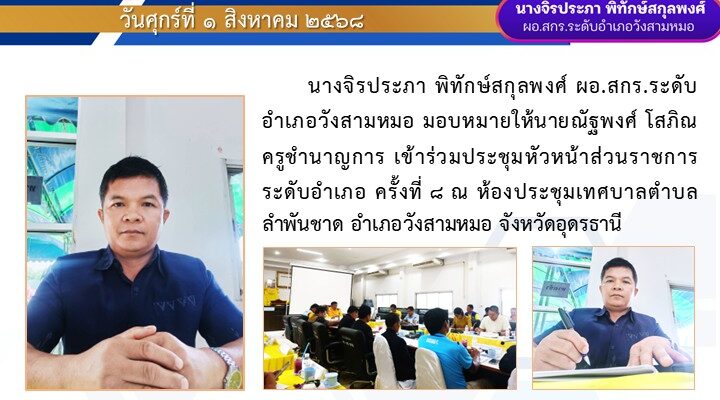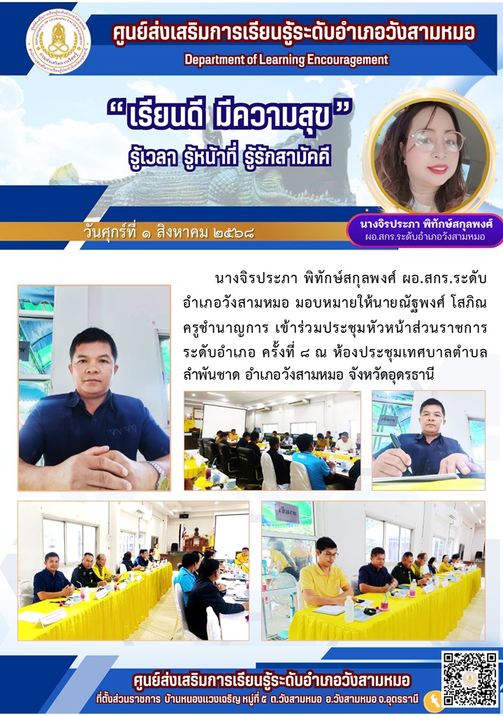 ข่าวประชาสัมพันธ์เข้าร่วมประชุมหัวหน้าส่วนราชการระดับอำเภอ ครั้งที่ ๘ กันยายน 25, 2025กันยายน 25, 2025 - by admin4110 - Leave a Comment วันศุกร์ที่ ๑ สิงหาคม ๒๕๖๘ นางจิรประภา พิทักษ์สกุลพงศ์ ผอ.สกร.ระดับอำเภอวังสามหมอ มอบหมายให้ นายณัฐพงศ์ โสภิณ ครูชำนาญการ เข้าร่วมประชุมหัวหน้าส่วนราชการระดับอำเภอ ครั้งที่ ๘ ณ ห้องประชุมเทศบาลตำบล ลำพันชาด อำเภอวังสามหมอ จังหวัดอุดรธานี