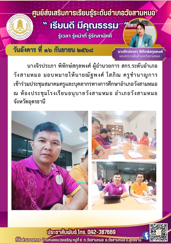 วันอังคารที่ ๑๖ กันยายน ๒๕๖๘ นางจิรประภา พิทักษ์สกุลพงศ์ ผู้อำนวยการ สกร.ระดับอำเภอวังสามหมอมอบหมายให้นายณัฐพงศ์ โสภิณ ครูชำนาญการ เข้าร่วมประชุมสมาคมครูและบุคลากรทางการศึกษาอำเภอวังสามหมอ ณ ห้องประชุมโรงเรียนอนุบาลวังสามหมอ อำเภอวังสามหมอ จังหวัดอุดรธานี